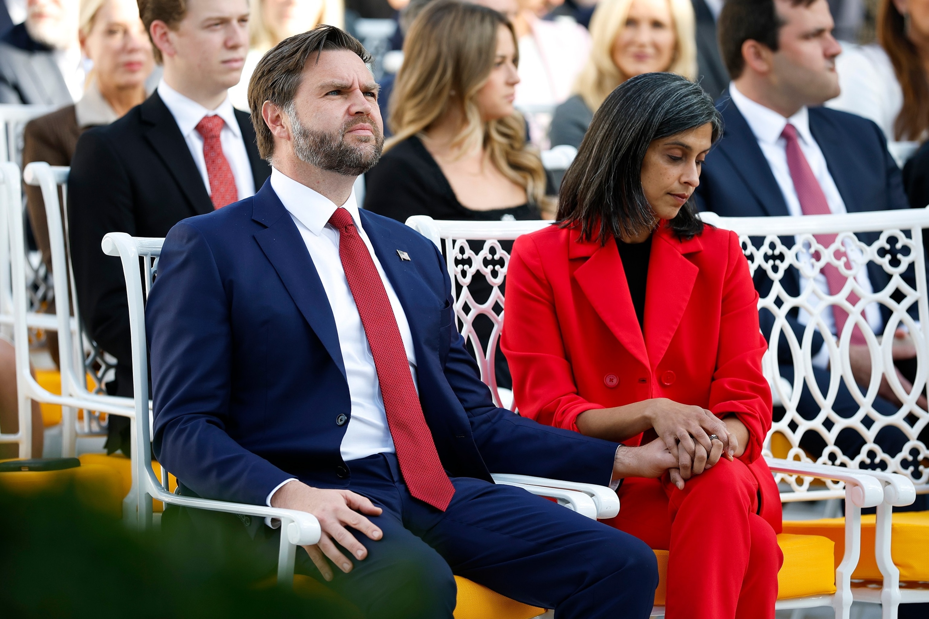 14 अक्टूबर, 2025 को वाशिंगटन में व्हाइट हाउस के रोज़ गार्डन में राष्ट्रपति पदक समारोह से पहले उपराष्ट्रपति जेडी वेंस अपनी पत्नी उषा वेंस के साथ बैठे।